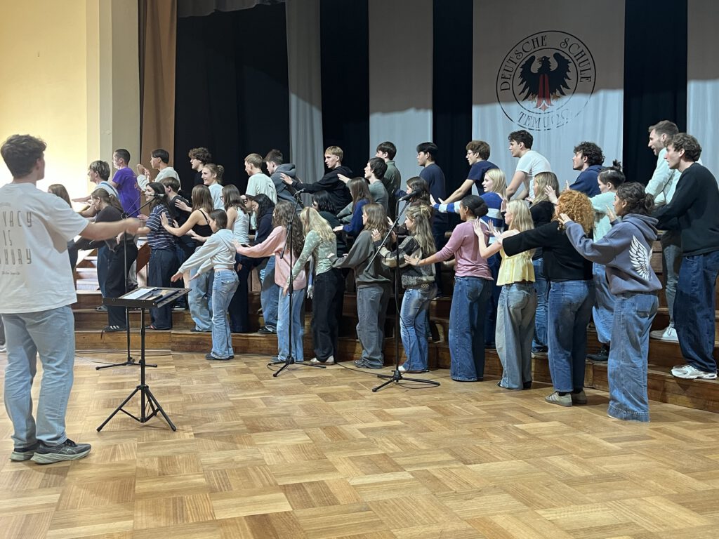 Dort angekommen, wurden wir lieb empfangen und hatten einen ersten musikalischen und kreativen Workshop. Wir haben mit Schüler*innen und Lehrer*innen der Schule gemeinsam gesungen, begleitet von Bewegungen und Rhytmusklatschen, haben uns selbst zu einem vorgegebenen Rhythmus Bewegungen, Geräusche und Tänze ausgedacht und so erste Kontakte geknüpft. Schon da ist uns aufgefallen, mit welchem Stolz die Schülerschaft hier Deutschland feiert und die Deutschlandflagge auf ihren Schuluniformen trägt. Ebenso waren wir beeindruckt, als wir daraufhin von einer Lehrerin eine Führung über das Schulgelände bekamen und sie von der Schule und ihrer Geschichte erzählte. So konnten wir sehen, mit welcher Sorgfalt und auf welch hohem Niveau die Schüler*innen an dieser Schule ausgebildet werden. Vom Kindergartenalter bis zum Abitur werden junge Menschen unterrichtet mit mindestens sechs Deutschstunden pro Woche, meist mit noch zusätzlicher Ausbildung.